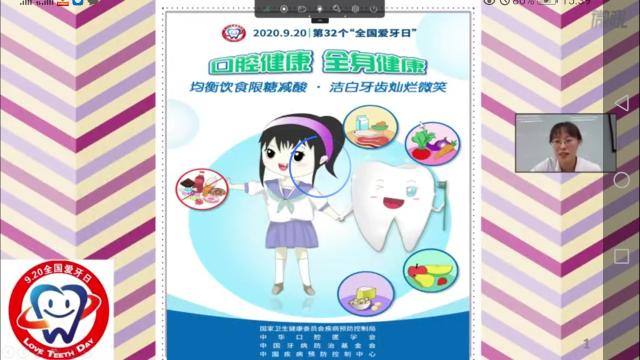 2020年9月20日是第32个“全国爱牙日”。由于疫情的原因,今年爱牙日活动举办的口腔健康讲座以微吼线上直播的形式进行,主讲人是口腔科的刘雅美医生。讲座的时间为40分钟,主题是:均衡饮食限糖减酸,洁白牙齿灿烂微笑。这也是今年爱牙日的宣传主题。