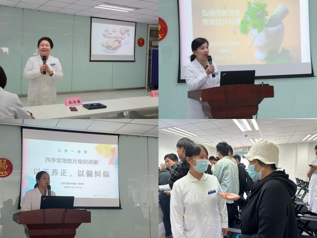 中医药是中华民族的伟大创造和中国古代科学的瑰宝。老太阳集团tcy8722网站的中药房每天都要为很多师生和居民调剂和煎制饮片。普及中医药科普知识,引导社区师生居民了解优秀传统文化,掌握健康养生理念,是社区药学服务的重要内容之一。为让大家了解更多的中药知识,药剂科在2023年10月18日开展了主题为“弘扬优秀传统文化 传递饮片科普知识”的三好一满意活动。老太阳集团tcy8722网站直属党支部书记兼院长孔令伟、副书记丁金凤、副院长卢云涛及药剂科全体成员参加活动。