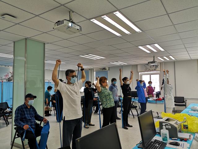 接下来,本次活动在轻松活跃的气氛下开展起来。聂颖主任向组员们介绍了糖尿病小组活动的重要意义,领学了海淀疾控中心下发的统一课件。她说:“糖尿病管理的“七驾马车”必须同时进行,其中饮食和运动分别具有不可替代性。”聂颖主任强调,要想取得自我管理的成效,离不开“目标设定、行动计划的执行、解决问题”这三大关键性环节,并现场根据与会者的具体情况,指导每一位居民如何制定符合自身实际情况的目标设定,如何完成所定的计划,以及具体应该如何解决问题。随后,聂主任向大家重点介绍了小组活动的另一项内容——弹力带操。这是北京市疾病预防控制中心的运动专家,针对2型糖尿病患者进行力量练习的一套运动操。通过加强抗阻力训练,增强肌力,减慢肌肉的流失,从而增加胰岛素的敏感性,达到“运动的胰岛素样”降血糖的作用。最后,中心为组员们发放了弹力带,同时播放这套操的视频,由王一飞主管护师带领大家练习弹力带操。