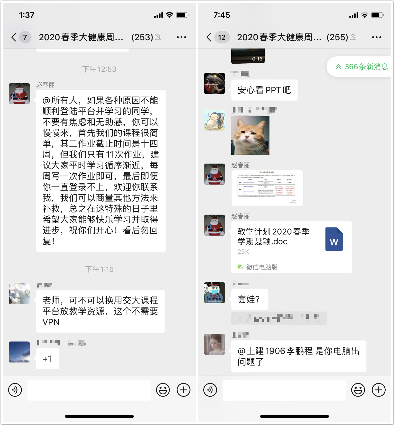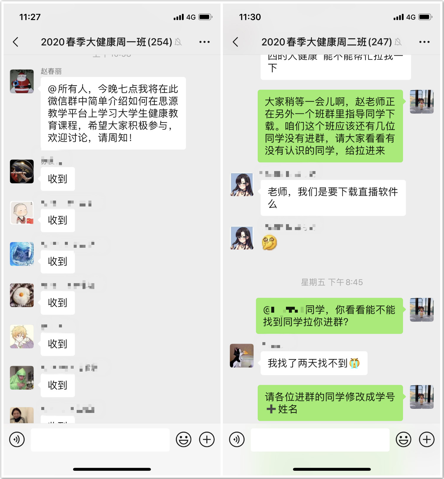 第四,让全部学生进群。我们事先根据四个班的上课时间命名了班号,学生们根据接到的通知和二维码扫码就能分别进入四个微信群,但是当每班超过100人后进微信群就需要要单拉,赵老师费了九牛二虎之力最后保证了1000位学生全部进群,畅通了师生之间的联络。同时,孙亚慧副主任、健康管理中心的聂颖、白雪医生也同时加入微信群,协助解决同学们的问题。
