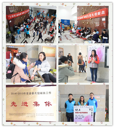 2014—2015年我校共有1650位师生献血,累计献血量370300ml, 并于今年获得了2014-2015年首都无偿献血工作先进集体,这份沉甸甸的荣誉,是对全校师生奉献、友爱、互助精神的最好诠释,也是学校素质教育无言却充满力量的展示。