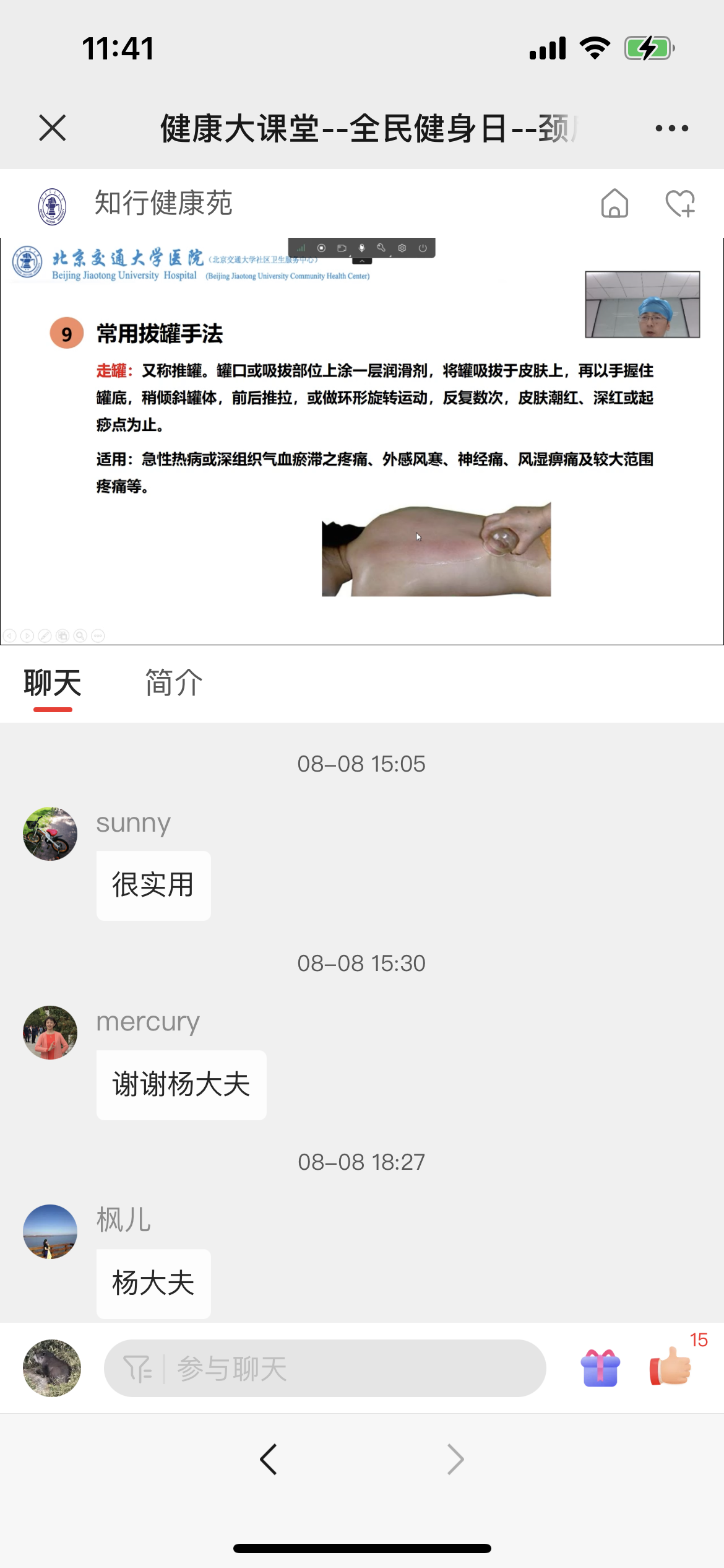 在招募培训中,我们根据家保员实际需求,坚持中西医相结合的原则,为大家传授一些简便易学的中医知识、加强同伴教育。中医科杨大夫为大家介绍了一套实用的颈肩操,缓解颈肩疼痛,让大家跟疼痛说拜拜!如果颈肩疼痛未得到有效缓解,该怎么办呢?杨大夫为大家介绍了一个自己在家就可以操作的新技能,养生保健的方法--中医拔罐。这次培训中,大家纷纷表示,这项技术非常实用,美中不足的是,因为采用线上培训,学员不能进行实际操作,希望以后还可以在线下组织一次,让杨大夫手把手教给大家这项有用的新技术!