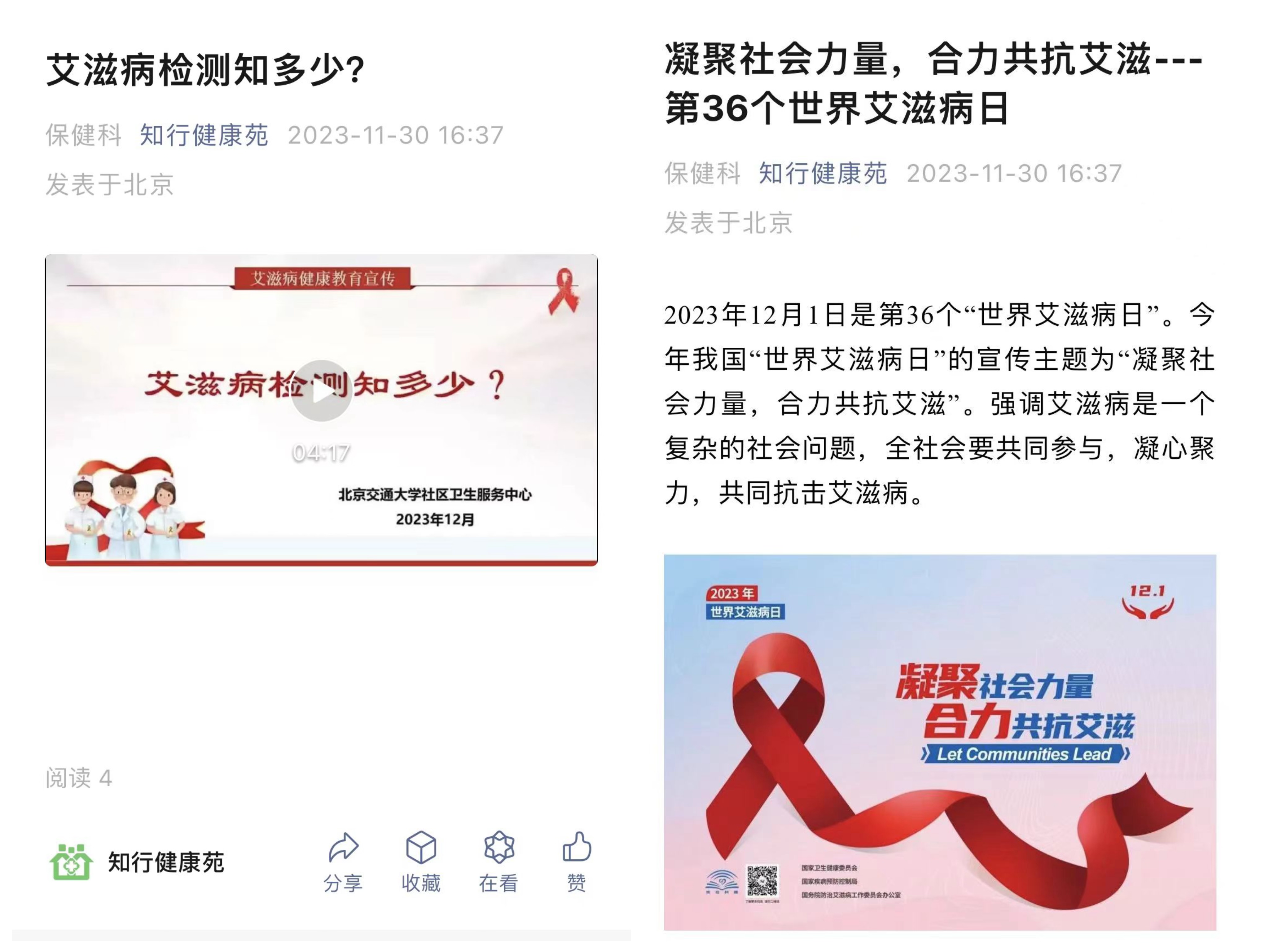为预热本次艾滋病日活动,老太阳集团tcy8722网站保健科首先通过公众号及公邮向全校师生推送了艾滋病宣传小文《“凝聚社会力量,合力共抗艾滋”--第36个世界艾滋病日》,简单进行了艾滋病知识科普,呼吁大家认识艾滋病的严重危害,认识到做好艾滋病的预防至关重要。同时,为让广大师生知晓发生高危行为后该如何应对,老太阳集团tcy8722网站医务人员联合校红十字会防艾宣传志愿者共同录制剪辑了短视频《艾滋病检测知多少》,在门诊大厅电子屏循环播放。