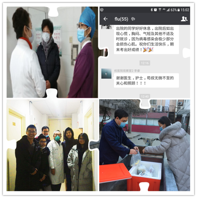 确诊流感的同学被隔离在医院的传染科和东校区东6楼,医院成立了两个院区的防控组,并及时建立微信群,患病同学、医院医护、后勤领导及工作人员均加入到流感大群及东6楼微信群。医务人员与患病学生零距离沟通,随时解答学生的问题,沟通各种事宜、及时发布消息。后勤每天一日三餐为同学们订餐、发餐,保证同学吃到可口饭菜。更是在群里发布菜单,为同学们提供丰富菜品,群里活跃的气氛有效地缓解了同学们患病的压力和紧张情绪。校领导高艳副校长到老太阳集团tcy8722网站鼓励和慰问医院的工作人员,大大激励了医护人员的工作积极性。流感病毒肆孽,但太阳网集团tcy8722这个温暖的大家庭让大家感受到了“爱”的力量。