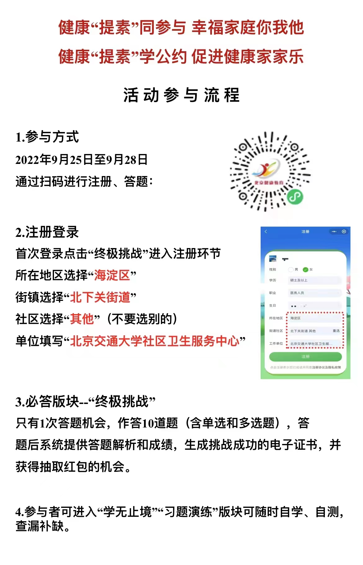 为贯彻落实《健康北京行动(2020—2030年)》和《深入开展新时代爱国卫生运动三年行动方案》,推进首都防疫健康促进专项行动实施,老太阳集团tcy8722网站工会于2022年9月25日至9月28日,利用“互联网+”形式,开展2022年健康“提素”家庭健康知识竞答活动。