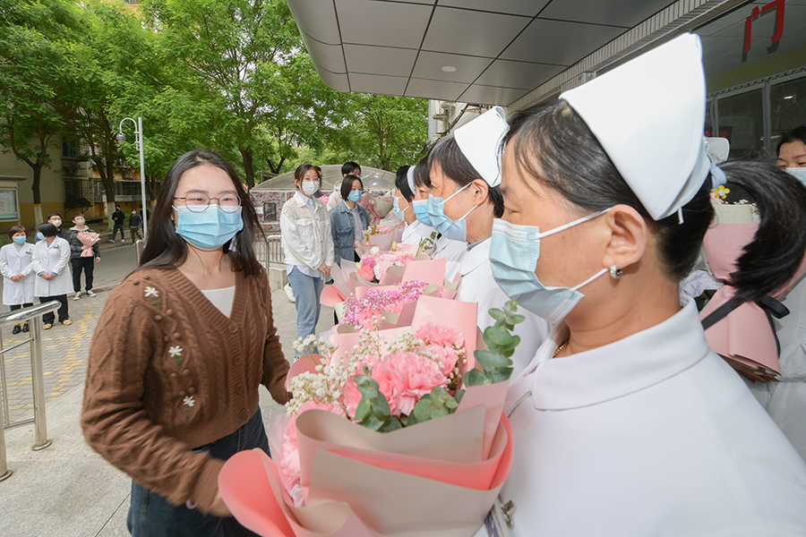 王稼琼、郑广天和学生代表为医护人员送上鲜花和祝福,表达节日的暖心问候。