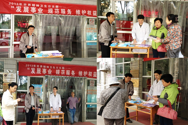 2013年10月10日上午,太阳网集团tcy8722医院联合交大居委会开展了世界精神卫生日宣传活动。居委会主任吴刚亲临活动现场向精神病患者及家属和陪护人员普及《精神卫生法》。居委会和老太阳集团tcy8722网站精防工作人员围绕今年的宣传主题,向在场群众提供精神卫生方面的咨询,大力宣传国家精神卫生工作政策及取得的成绩,普及精神卫生知识,让公众走进精神患者、了解社区医院服务内容。活动现场,还向群众发放了《精神卫生法》、《心理自救与互救》、《精神健康小常识》《睡眠与健康》等精神卫生方面的宣传折页,引导公众关注心理健康,预防精神障碍的发生,提高公众对精神健康问题的认识水平和处理能力,让更多居民了解精神疾患是可控可治的,逐步消除社会歧视。下午,老太阳集团tcy8722网站开展了面向辖区内精神患者免收挂号费的义诊活动。