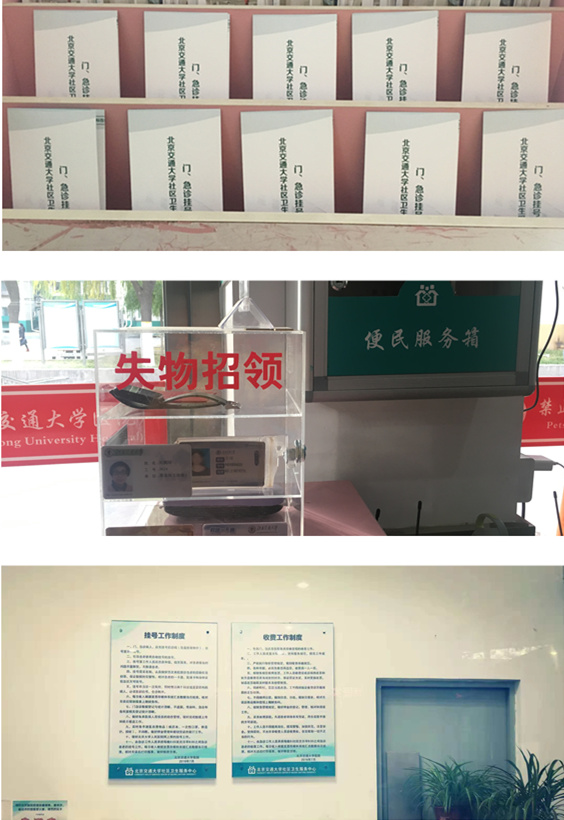 近几年留学生就诊日益增多,为方便窗口挂号和学生就诊,制作了中英文就医流程,方便工作人员挂号和留学生患者就诊。挂号收费窗口经常有遗漏的一卡通、医保卡、银行卡或者物品等,科室也没有合适的地方安置,特购买了失物招领收纳箱,可以放置患者遗失物品,也方便患者查找。