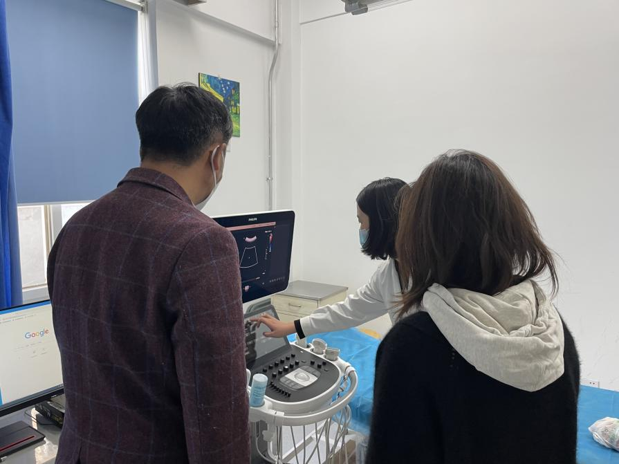 3、学生向等待检查的老师科普宣传:做上腹部超声检查需要空腹8小时以上,检查前一天晚上最好清淡饮食。