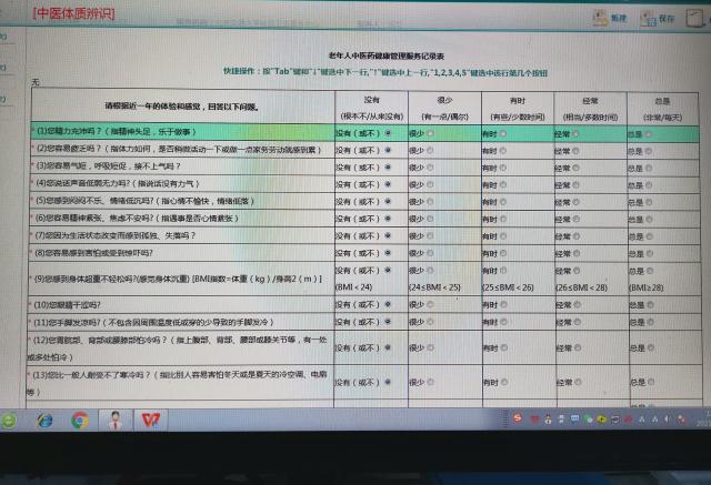 为了更好地把握体质辨识的方法,大家在迟主任的指导下,认真学习了国家基本公共卫生服务项目体质辨识33问内容,通过学习,每个人都掌握了统一、规范、正确的辨识及录入方法。尤其强调了向65岁以上老年人解释为什么每年需要做体质辨识的原因,以及持续做体质辨识的意义,指导老年人日常生活的饮食调理和运动保健,做到未病先防、已病防变。