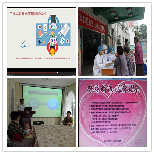创设“知行健康苑“微信公众平台,探索新媒体平台下开展健康宣教;开发动漫版慕课宣传课件,探索让公众喜闻乐见的健康宣教形式;提高慢病管理水平,为患者发放《慢病自我管理手册》;关爱老年人精神健康,为老年人进行《Zung氏焦虑、抑郁自评量表》筛查,了解老龄心理健康状况,开展心理指导;关注儿童健康,开展家庭喂养行为与儿童早期发展培训讲座;B超室耦合剂加温仪为患者送温暖;家庭医生式服务团队深入学院,为在职教职工提供多元化的健康服务;通过为社区居民开展健康讲座等多种形式发挥青年医师的专科特长;为准妈妈孕期保健宣教—叶酸补充知识咨询;眼耳鼻喉科为教工的眼、鼻等部位的体检结果统计分析;护理部开展工作绩效统计软件设计与开发;设计静脉输液、采血个性化提示卡片制作与发放;利用微信平台进行护理业务知识培训与护理风险防控;面对社区居民开展爱牙日口腔保健宣传讲座和义诊;制作“牙周基础治疗后注意事项”患者须知单;理疗科诊室环境进行了改造;为社区居民开展中医专题系列讲座;为老年人开展“中医体质辨识”体检;方便患者,开展自助挂号、收费机的宣传活动;改善病案室环境,合理安排病案室空间,方便教职工使用;制作公费医疗报销宣传片以微信形式传播至每位同学;学习药学服务礼仪和沟通技巧。