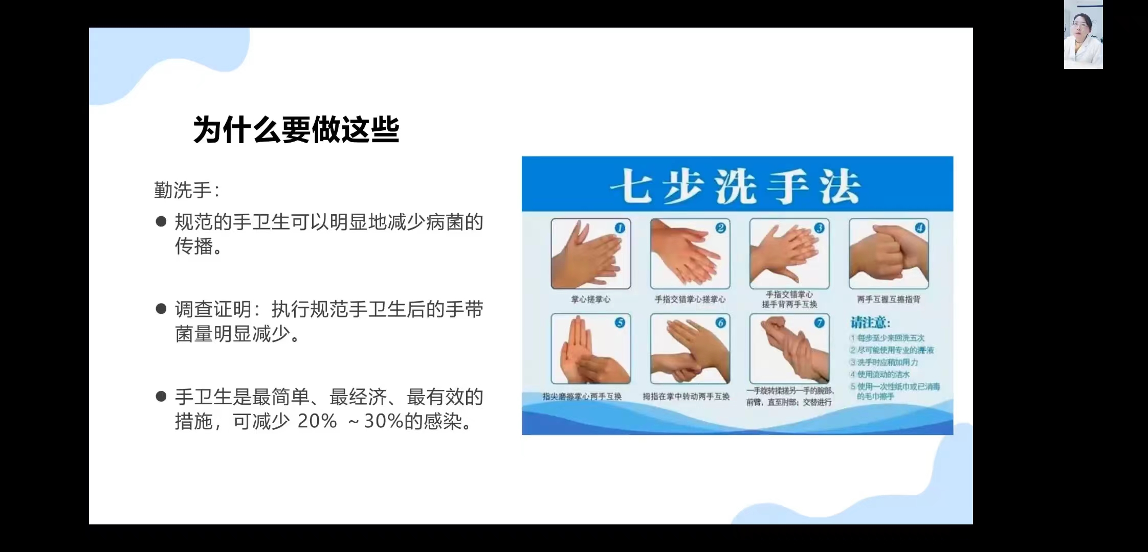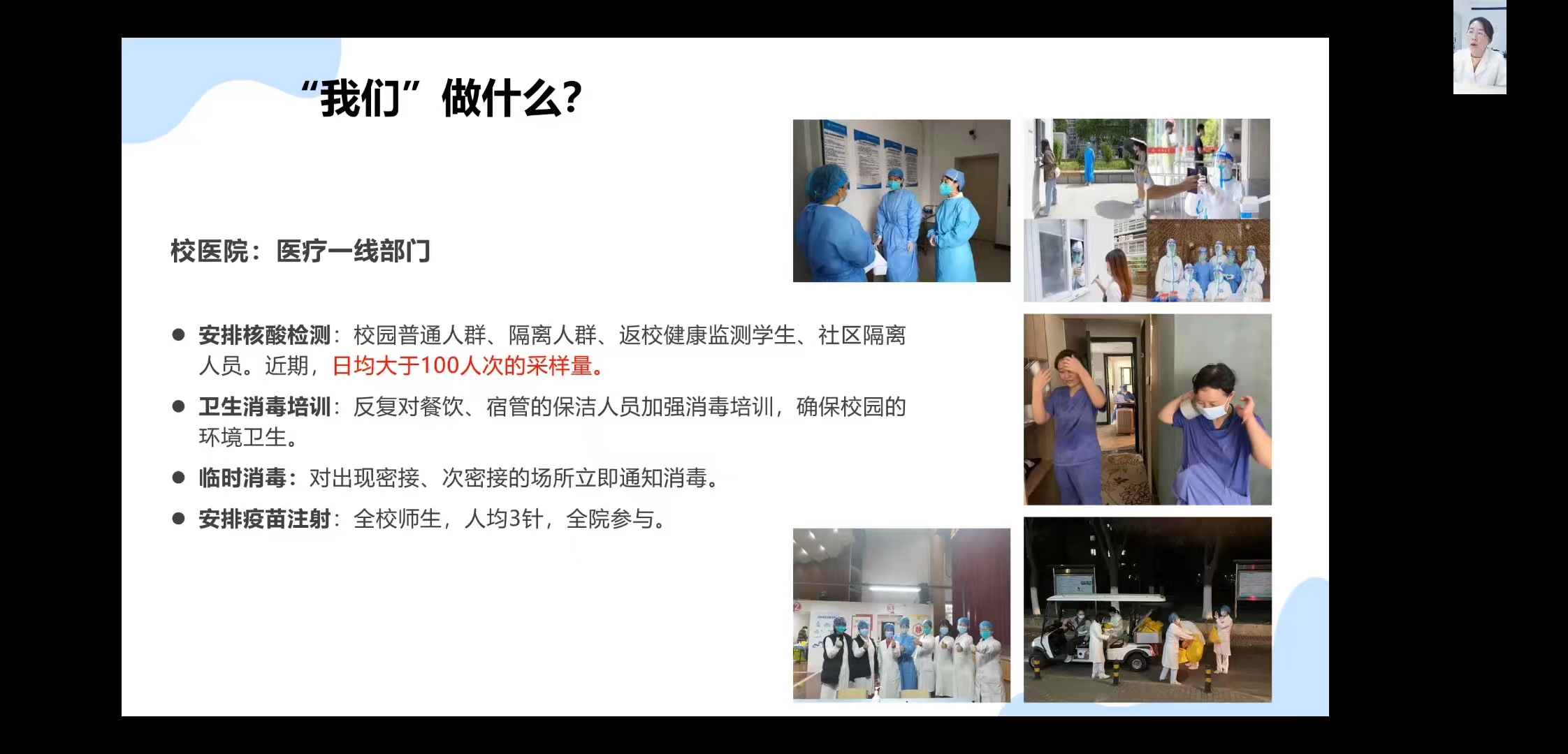 王露医生在新冠疫情防控岗位工作了5个多月,亲身参与和处理了几起聚集疫情,参加了全校疫情应急演练和师生新冠疫情流调系统的开发及修订,处理了大量的台账和隔离相关工作,在疫情防控方面积累了大量的经验。因此,特地邀请她为志愿者们开展线上培训。