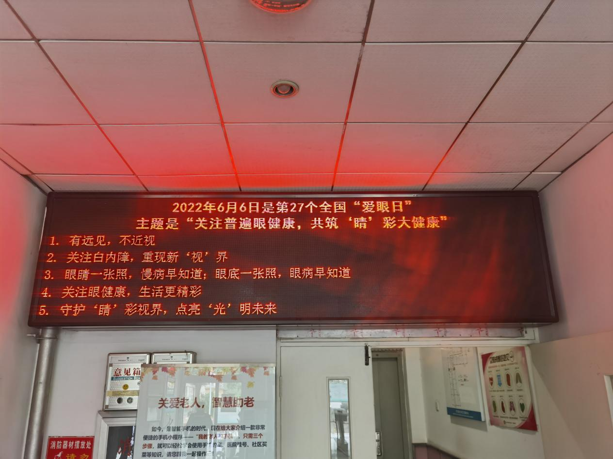 同时,我们利用门诊大厅的LED屏滚动播出今年的活动主题“关注普遍眼健康,共筑‘睛’彩大健康”,及五大宣传口号:1.有远见,不近视;2. 关注白内障,重现新‘视’界;3. 眼睛一张照,慢病早知道;眼底一张照,眼病早知道;4. 关注眼健康,生活更精彩;5. 守护‘睛’彩视界,点亮‘光’明未来。旨在引起人们对眼病的关注,倡导眼病的早防、早筛、早诊、早治。