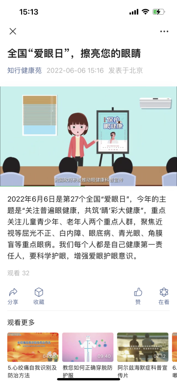 为了更好宣传“爱眼日”,增强全社会爱眼护眼意识,我们在微信公众号--知行健康苑播放了由国家卫生健康委员会医政医管局、全国防盲技术指导组联合人民网·人民健康、人民好医生客户端制作宣传视频,获得多次阅读与转发。