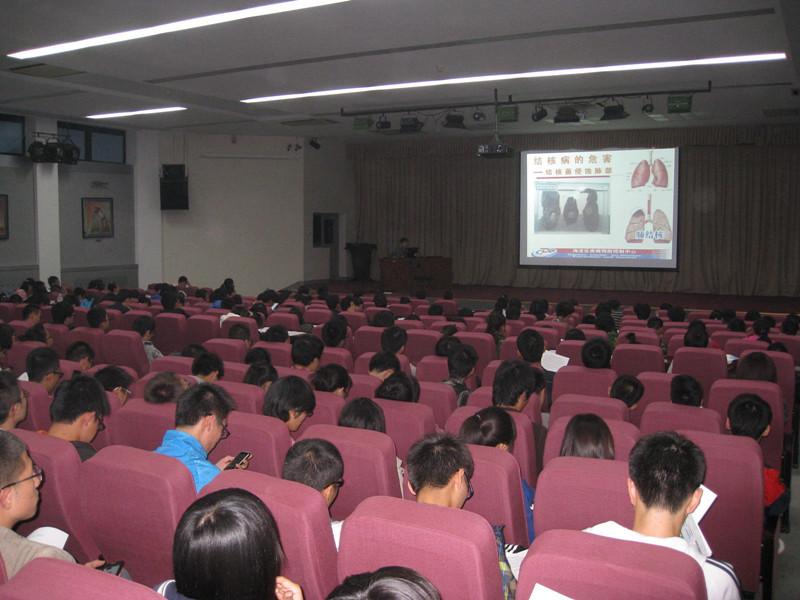 除此以外,我们还利用了电子邮件、学校知行论坛、微信、微博、校园广播等多种新型快捷的宣传方式,在学生群体中宣传结核病防治知识,努力提高师生的知晓率。3月24日下午,在学校中心报告厅举办了一场结核病防病知识讲座,参与者达200多人。保健科大夫为同学们进行了细致的讲解,现场气氛热烈,同学们认真听讲、积极提问,普遍反映收获良多。