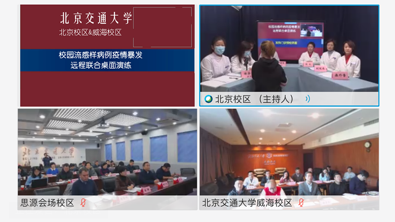 本次演练是应用远程技术进行两校区多点远程联合演练的一次尝试和探索,对北京和威海校区传染病联合防控提供了新的思路。整个演练严谨流畅,锻炼了学校处理突发公共卫生事件的队伍,提升整体应急处置能力,收到了良好的效果。