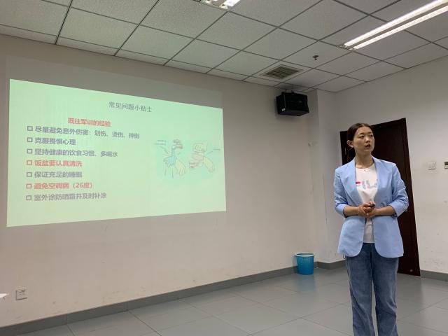 许白桦大夫代表医疗队表示一定会以高昂的工作热情和严谨的工作态度做好军训医疗外勤,为同学们提供医疗保障,做到三全育人,呵护同学们的心灵和身体,尽全力配合军训旅完成军训任务。