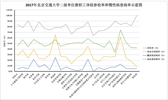 体检结束后,老太阳集团tcy8722网站对全校各二级单位的体检数据进行了统计分析,并与2016年的数据进行了对比,发现了一些现象。首先,各单位参检率差别很大,波动在64%-100%,说明不同二级单位的教职工对体检的重视程度差异很大。第二,不同二级单位高血压、糖尿病、血脂异常的患病率差别也很大。高血压病的患病率为8.75%-65.65%,糖尿病的患病率为0-24.84%,血脂异常的患病率为34.38%-74.19%。从上图的曲线我们可以看出,上述三种疾病的患病率在同一单位基本上呈相同的趋势,即在某些单位三种疾病的患病率同时处于较高的水平。第三,统计分析发现,男性教职工超重、肥胖、高尿酸血症、血脂异常、脂肪肝、高血压和糖尿病的发生率明显高于女性。