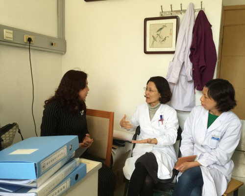负责慢病及健康管理工作的副院长卢云涛向张雪茹老师介绍了交大目前慢病患者管理的具体措施和今年的工作思路和想法。负责健康自助检测的唐松梅副主任护师、健康教育的赵春丽医生及个性化指导以及高危患者干预的孙伟娜副主任医师分别介绍了各自工作情况,张雪茹老师对交大的资料进行了检查。