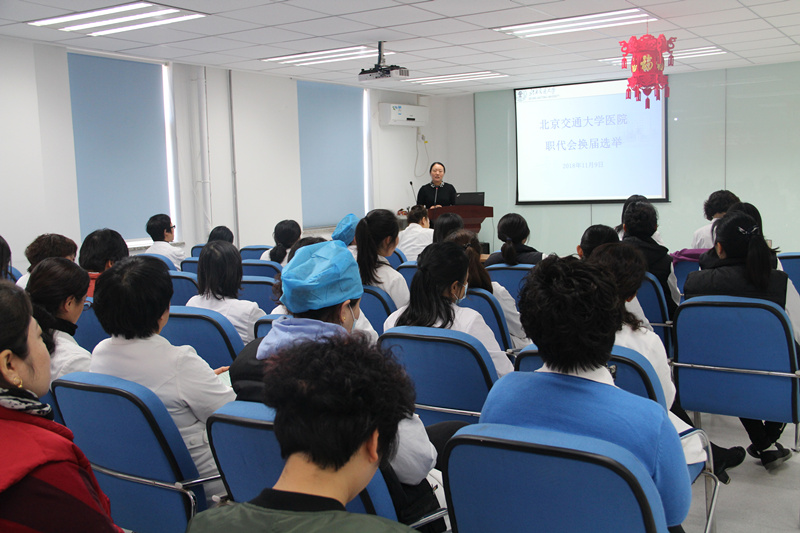在校工会指导、院直属党支部领导下,我院职工代表大会换届选举、院工会委员会换届选举、参加学校“双代会”的代表选举全院职工大会于2018年11月9日在门诊楼三层会议室召开,63名工会会员参会。老太阳集团tcy8722网站直属党支部书记康俊主持会议。