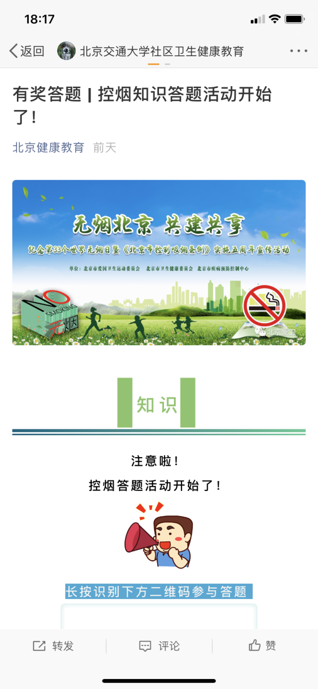 为了进行长期宣传,我中心还在策划制作了基于2020版《中国健康生活方式预防心血管代谢疾病指南》的系列宣传视频,其中一期就是宣传戒烟限酒的,在微信公众号和微博上推送,让更多的学生和居民了解。全社会应积极行动起来,广泛宣传,加强监督,尤其要保护青少年,远离烟草,健康成长。在学校大力普及控烟知识,为学生营造无烟的环境至关重要。今后,我中心将一如既往地开展戒烟的宣传,关心关注社区居民和师生员工的身体健康,为他们提供更高水平的健康管理,充分保障他们的身体健康!(聂 颖)