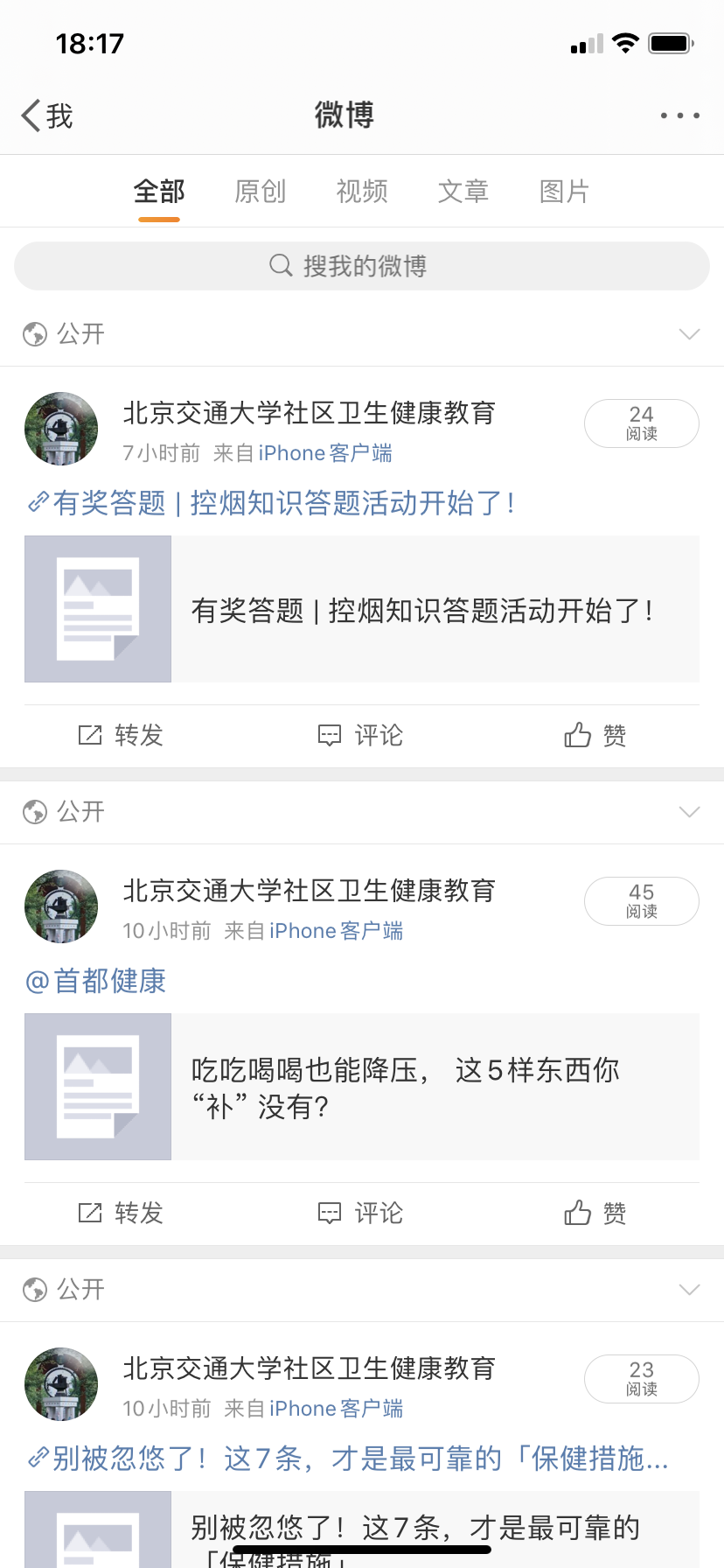 日前,我中心通过多途径开展线上、线下宣传活动。首先,在门诊大厅LED屏播放无烟日主题,并利用微信公众号、微博进行宣传信息推送,同时将上级健康教育微信公众号上的活动推送给网友和我院职工,号召大家积极参与“无烟家庭”申请及“控烟知识问题”等活动。在5月出版印刷的我中心自制刊物《健康列车》上也刊登了宣传戒烟的相关文章。