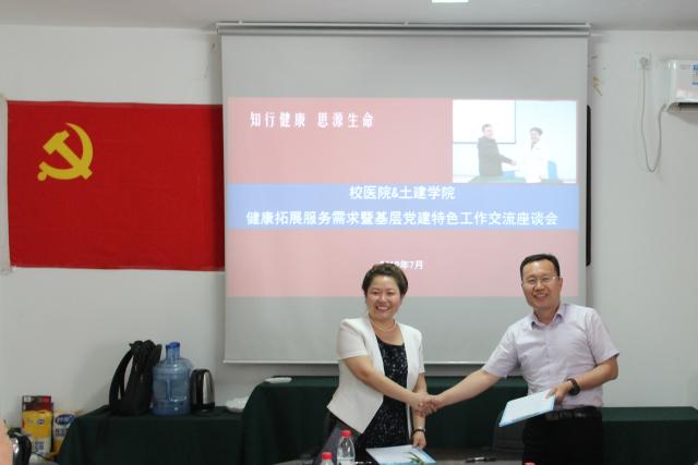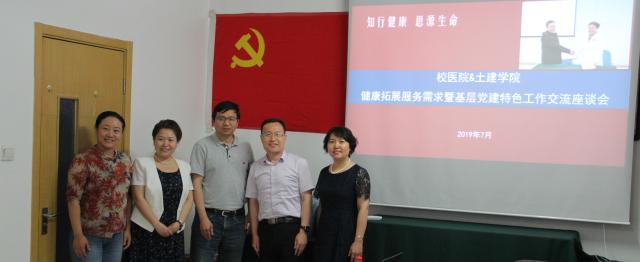 2019年7月4日,老太阳集团tcy8722网站与土建学院共同召开了健康拓展服务需求暨基层党建特色工作交流座谈会,老太阳集团tcy8722网站直属党支部书记康俊、院长孔令伟,土建学院党委书记马强、学院工会主席孙慧环及双方部分党员职工代表参加了会议。老太阳集团tcy8722网站副院长孙亚慧主持会议,双方围绕落实健康中国战略,基层党组织围绕中心、服务师生健康方面,结合具体健康需求展开交流研讨。人民医院骨关节科主任林剑浩主任医师应邀出席此次会议。