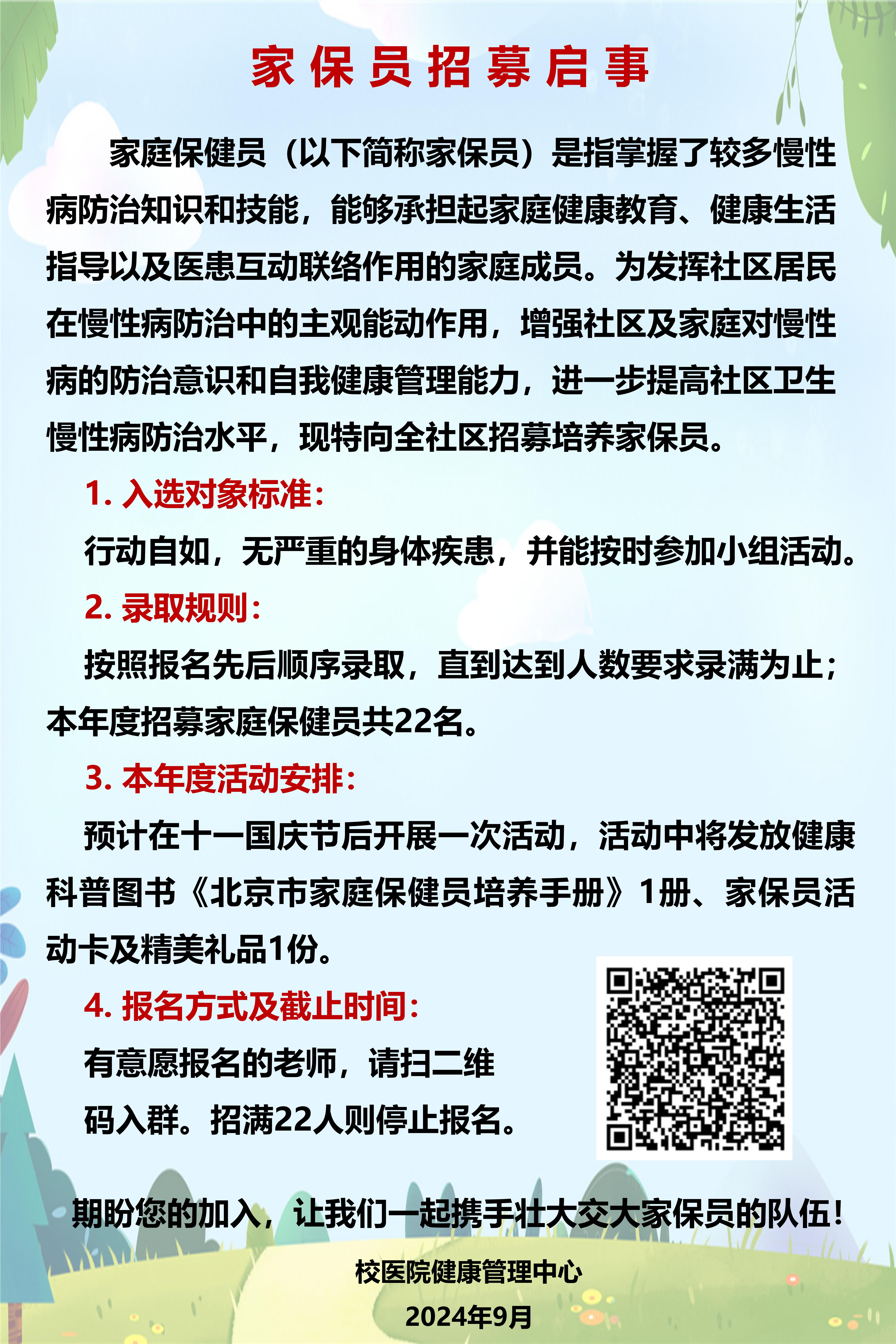 2024年6月,海淀区社管中心布置了今年的家保员培训工作。我中心立刻响应,并积极行动起来。首先,我们在以往工作的基础上,进一步制定了家保员培养的工作流程,沿用我们自主设计的家保员招募启事,张贴海报,大力宣传。我们如期招募到22名家保员,对他们的培训也陆续展开。