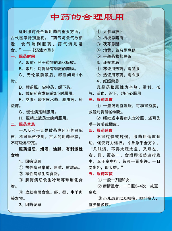展板详细介绍中药饮片的煎药方法和服用方法,其中煎煮方法包括了从容器的选择、溶剂的选择、浸泡的时间、煎药时间、煎药的火候和次数、特殊药物的煎煮方法等;服用方法包括了服药时间、服药禁忌、服药温度、服药速度、服药次数等,指导患者能正确的方法、正确的时间、正确的剂量来使用中药饮片,达到药品使用的最佳效果。