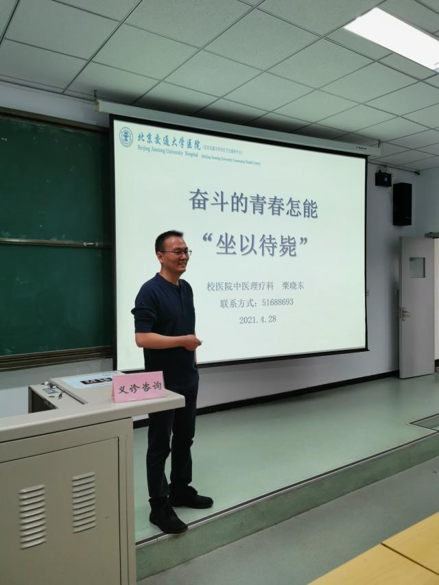 针对上述问题,中医科急同学们之所急,充分发挥专业优势,通过精心准备,由科主任带队,栗晓东大夫主讲,康复技师参加,为同学们讲解了颈椎病与脱发的相关知识及保健、治疗措施,详细的介绍了颈椎退变的过程、诱发原因及治疗方法,分享了脱发原因、分型、用药和其他治疗方法。现场还进行了颈部拉伸和手法按摩的教学,让各位同学能够快速掌握了颈椎病的预防保健方法,也为防脱发指明了方向。