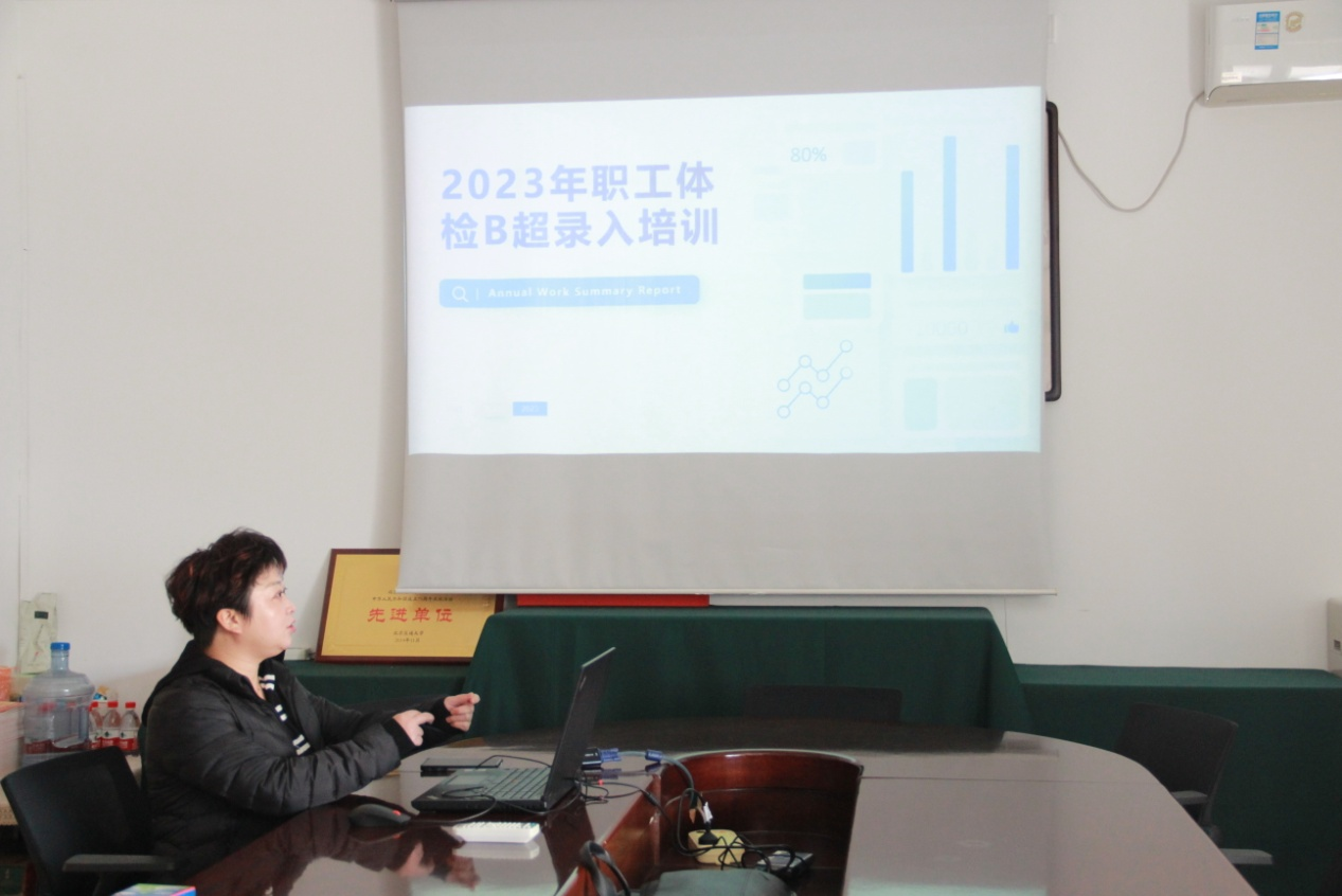 2023年的职工体检由医院办公室、中医科和药剂科三个科室的职工共同承担男女B超的录入工作。3月27日中午,项目负责人杨洁宇主任对全体录入员们进行了B超录入岗前培训,超声室邱文风大夫也应邀参会答疑。
