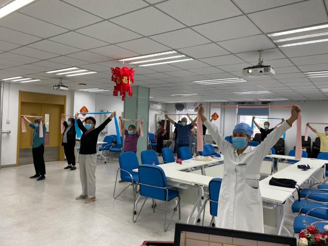 最后,健康管理中心的王一飞主管护师,带着组员们一起做了专门为老年2型糖尿病患者推出的弹力带操,活动在轻松愉快中结束。