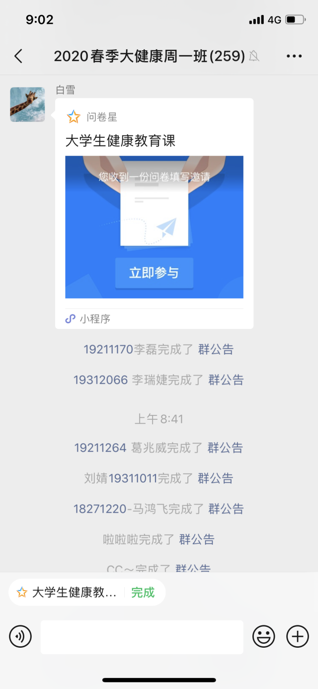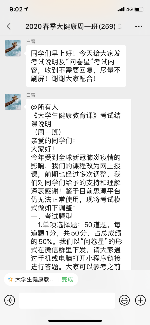 接着,我们将制作的问卷星在健康管理中心内部进行了测试,每位医护人员都进行答题、计时,并反馈发现的问题,及时进行修改。由于今年是首次启用这样的形式进行考试,大家对此项工作都给予了高度重视,也非常配合。今年的考试,我们仍采用两部分,一部分是问卷星答题,另一部分是创作作业,学生按照命题写好后通过邮箱发送给老师进行批阅。在本课程开始时,我们为每班建立一个微信群,共建立了四个群,问卷星调试好后,我们先在一个群里发布了考试信息,发现学生们接受起来非常快,操作没有任何问题,随后我们在另外三个群里广泛铺开。