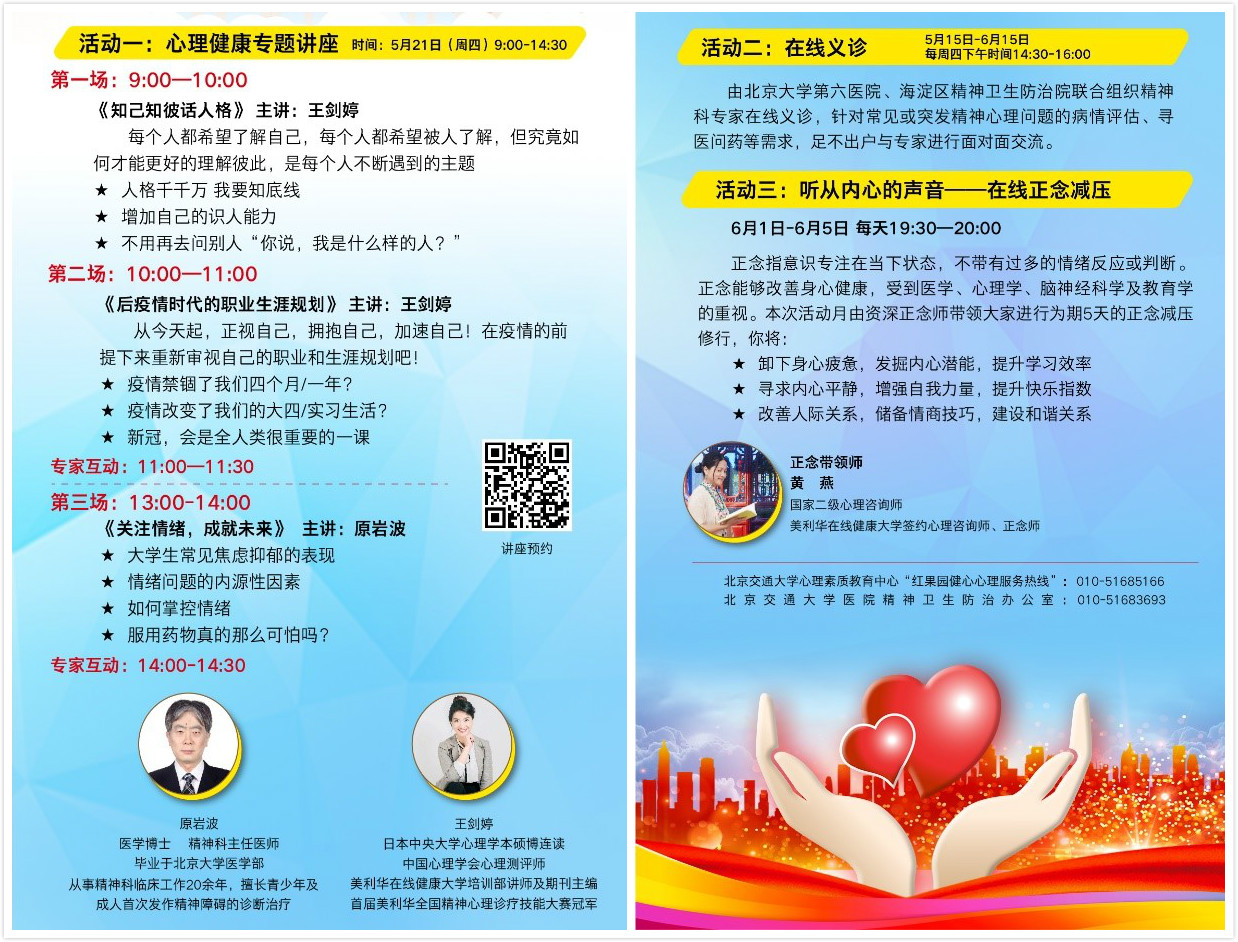 在海淀区高校心理健康服务联盟及北京市海淀区精神卫生防治院的指导下,今年“5.25”大学生心理健康服务月,太阳网集团tcy8722医院联合大学生心理素质教育中心,以“聚力同心 战疫同行”为主题,通过互联网形式开展心理健康专题讲座、义诊、正念体验活动,审视疫情之下大学生心理健康成长的机遇和挑战,为这个关爱大学生心理健康的节日赋予丰富的内涵。
