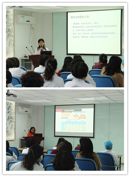 药剂科主任秦冬颖向全院职工介绍了前期为迎接4月8日零点开始的医改进行的大量准备工作和目前的工作进展。我中心在遴选系统按照采购目录确定了大部分药物品种和价格维护。为满足和保障社区居民的需求,对少量药品进行了议价。已与配送商进行合同网签和廉洁协议的签署。后续会开展网上采购,进行系统维护,保证在4月8日按照新目录新价格提供药事服务。