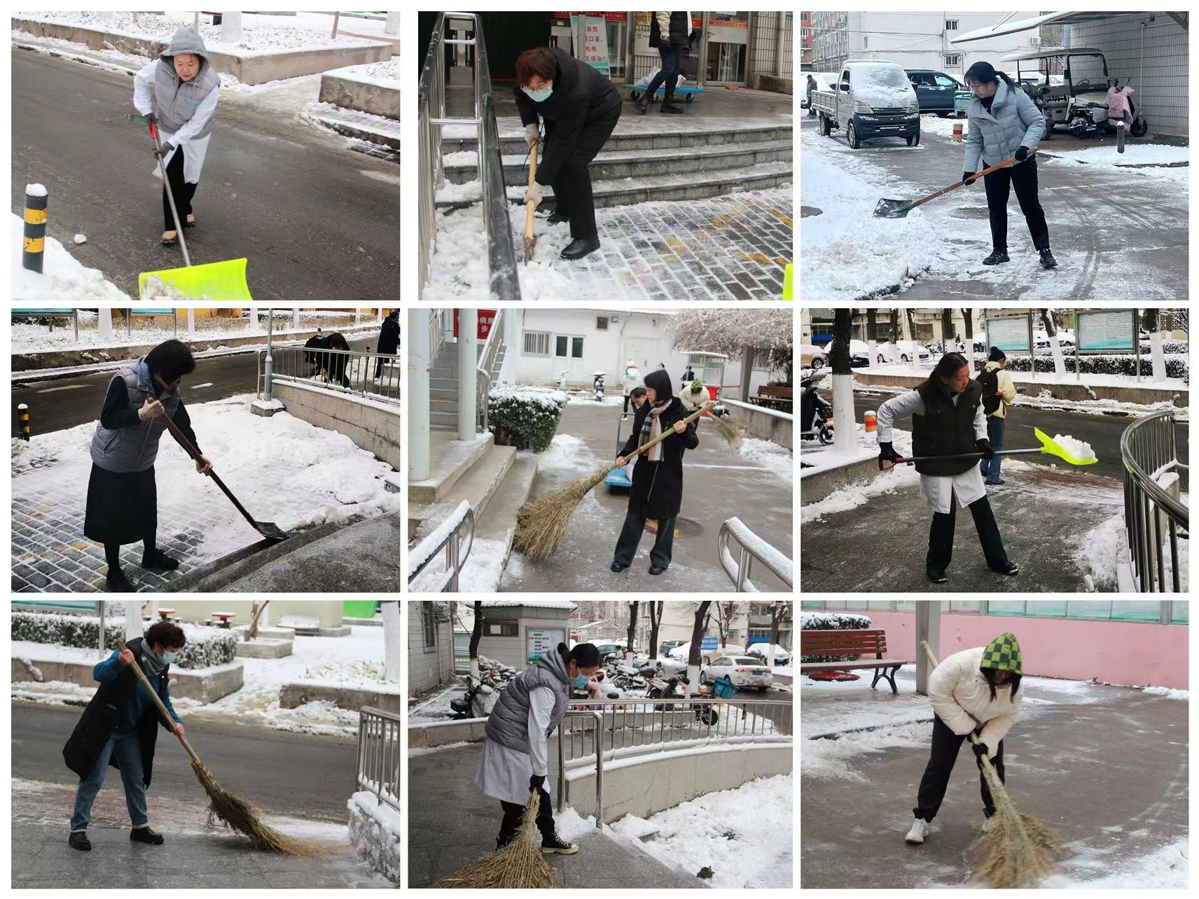 党员们拿起铁锹和扫帚,不畏寒冷,脚踩湿滑的路面,从医院大门前到急诊再到医院发热门诊最后到行政楼前,你铲我扫相互配合,干劲十足,很快就把医院主要出入口和道路清扫干净,看着大家齐心协力开辟的“安全就医通道”,大家脸上洋溢着开心的笑容。