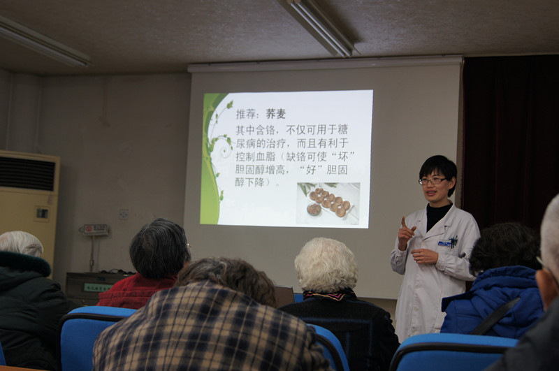 毕大夫主要从5个方面讲解了血脂异常的常见问题,并且详细讲解了血脂异常后生活方式的调整。毕大夫告诉大家水果、蔬菜的吃法,烹调油的选择及全谷类食物的好处。介绍了小凉菜“洋葱拌木耳”的做法及功用以及家庭自制荞麦包等健康科普知识和实用技术。家庭保健员认真听讲的同时积极与毕大夫讨论烹饪技巧和营养学知识,讲座气氛轻松活跃,家保员也从中学到了不少防病养生知识。